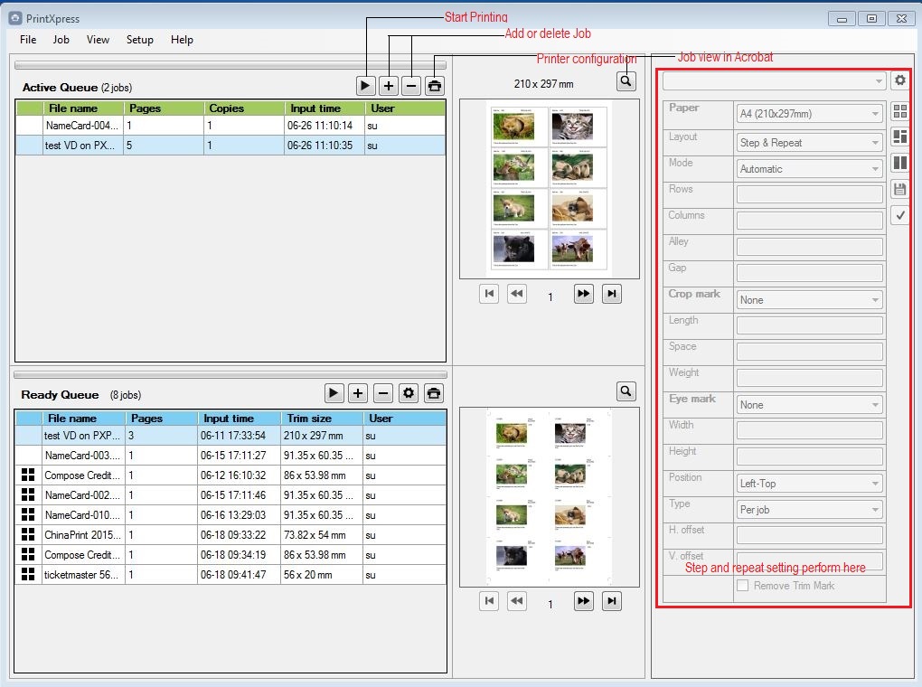 • The Ready Queue prepares jobs for printing—for example, arranging multiple name cards on a sheet to optimise paper usage.