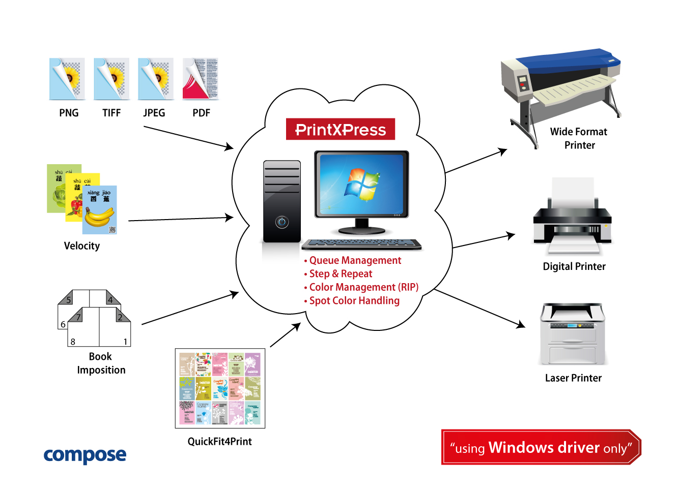 PrintXPress incorporates several features not commonly found in standard Windows drivers, such as colour management, JPEG image processing (including options for images from mobile devices), step and repeat functions for tasks like name cards and membership cards, and automated imposition for booklet creation, whether saddle-stitched or perfect-bound. These capabilities aim to increase printing efficiency and reduce manual intervention.