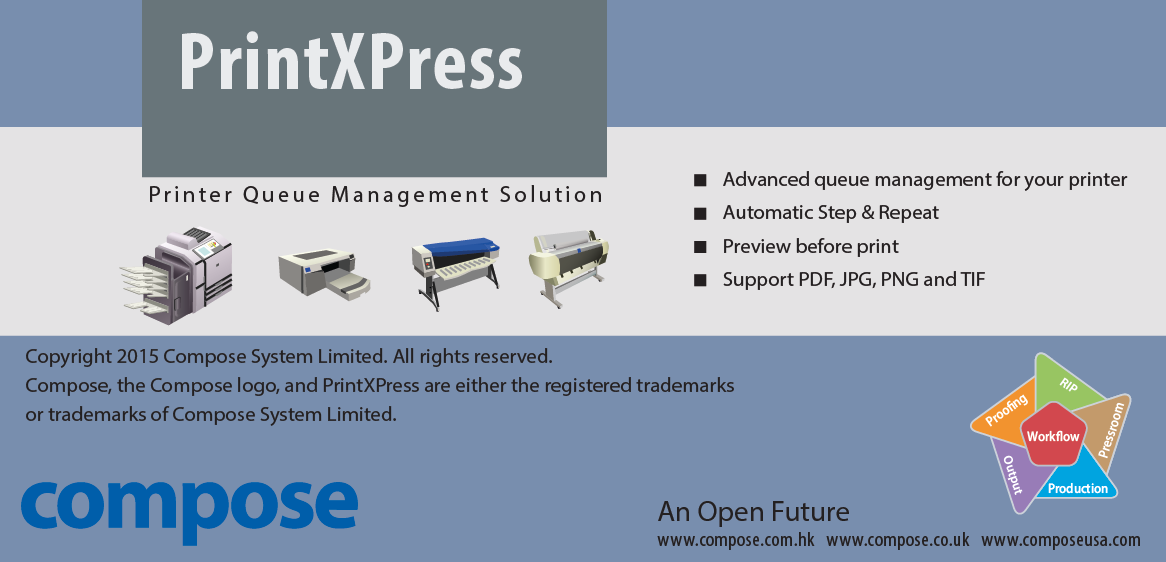 PrintXPress is a Client and Server solution intended to ease all the pressure for those working in a busy print environment. Sending jobs to print will be a task back to the designer or operator, allowing them to have a greater say how the document should be printed.