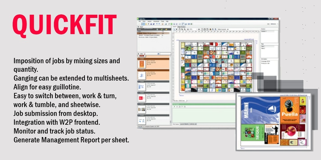 QuickFit is a solution designed for a busy print shop with a large variety of jobs coming in. Jobs can be either submitted via the web based job submission utility, or from any MIS system that can generate a job ticket with logistic and printing instruction. It has a Database running in the background for job management designed to work for any size of job. This highly automated approach will help to increase productivity and achieve greater saving.