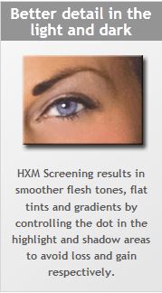 The challenge with conventional AM screening is to be able to print the smallest dots possible to enhance the detail, maintain highlight detail and to provide smooth gradients where present. HXM screen have been designed to solve the printing challenges that come from printing at higher screen rulings.