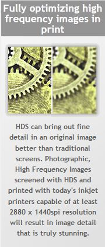 HDS eliminates the grainy highlight effect experienced with some FM screening methods particularly apparent in smooth areas of continuous tone pictures, flat tints, and vignettes. The HDS dispersed but still clustered approach dramatically improves the printability, stability, quality and predictability of the printing process. Because individual spots do not randomly cluster into structures with odd sizes and shapes, graininess is reduced compared with other FM screening methods.